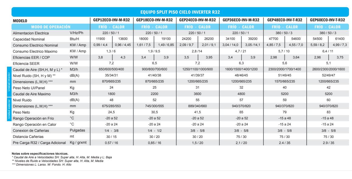 Split Piso Cielo Bomba de Calor 12000 BTUH R32. Alimentacion Monofasica 220V/50HZ. Incluye Kit de Cañeria de 5 mt.